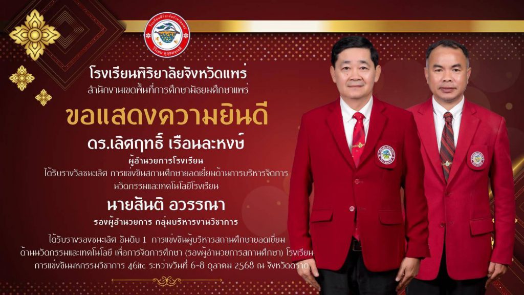 คณะครูโรงเรียนพิริยาลัยจ.แพร่ สพม.แพร่ขอแสดงความยินดีกับ ดร.เลิศฤทธิ์ เรือนละหงษ์ผู้อำนวยการโรงเรียนพิริยาลัยจังหวัดแพร่ได้รับรางวัล “ชนะเลิศ”สถานศึกษายอดเยี่ยมด้านการบริหารจัดการนวัตกรรมและเทคโนโลยี โรงเรียนนายสันติ อวรรณารองผู้อำนวยการโรงเรียนพิริยาลัยจังหวัดแพร่ได้รับรางวัล “รองชนะเลิศอันดับ 1“ผู้บริหารสถานศึกษายอดเยี่ยม ด้านนวัตกรรมและเทคโนโลยีเพื่อจัดการการศึกษา (รองผู้อำนวยการสถานศึกษา)งานมหกรรมวิชาการกลุ่มโรงเรียนผู้นำ 46ict โรงเรียนในฝันและเครือข่าย เจ้าภาพจัดการแข่งขัน ประจำปีการศึกษา 2568โรงเรียนตราษตระการคุณ จังหวัดตราด