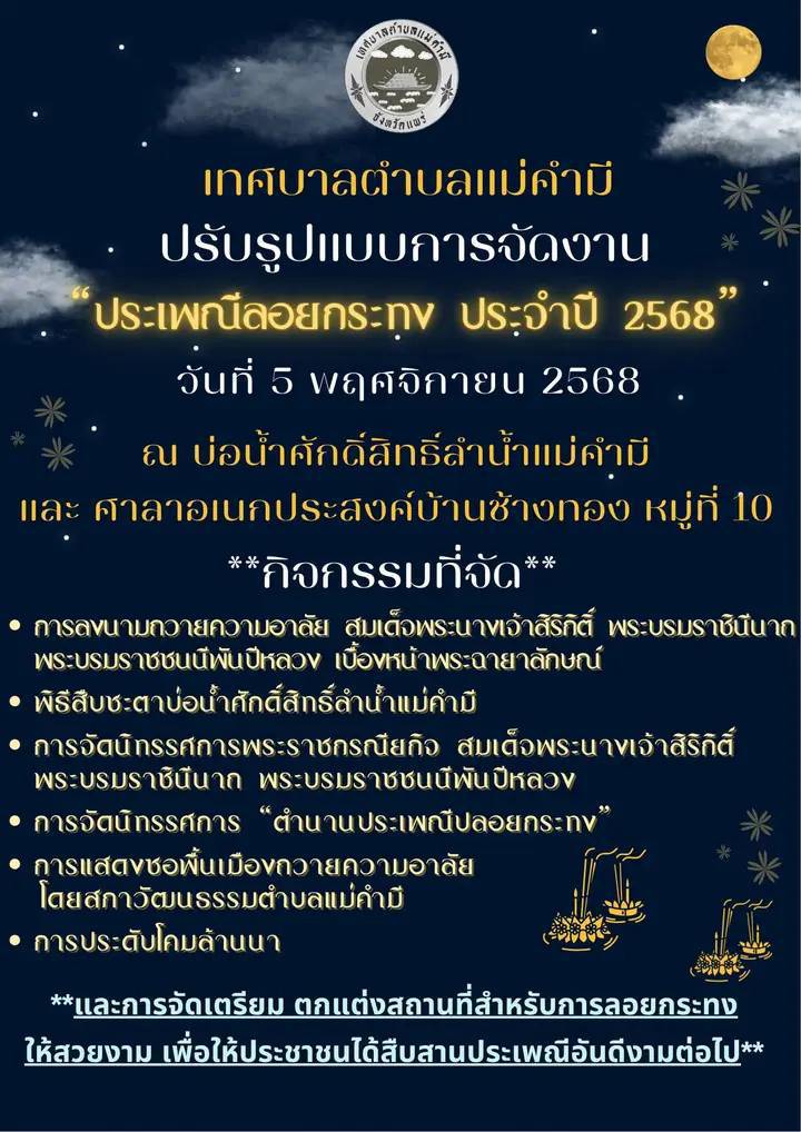 นางสร้อยทอง หล้าคำมี นายกเทศมนตรีตำบลแม่คำมี อ.เมือง จ.แพร่แจ้งประชาสัมพันธ์ การจัดงานประเพณีลอยกระทง ประจำปี 2568เทศบาลตำบลแม่คำมี ได้ปรับรูปแบบการจัดกิจกรรม ประเพณีลอยกระทง ประจำปี 2568 ให้เรียบง่ายและงดงาม เพื่อความเหมาะสมกับช่วงถวายความอาลัย**โดยมีกำหนดจัดขึ้น ในวันพุธที่ 5 พฤศจิกายน พ.ศ. 2568 เวลา 09.00 น. เป็นต้นไป เพื่อสืบสานวัฒนธรรม ประเพณีอันงดงาม สถานที่ : ณ บริเวณบ่อน้ำศักดิ์สิทธิ์ลำน้ำแม่คำมี และศาลาอเนกประสงค์บ้านช้างทอง หมู่ที่ 10 ตำบลแม่คำมี อำเภอเมืองแพร่ จังหวัดแพร่