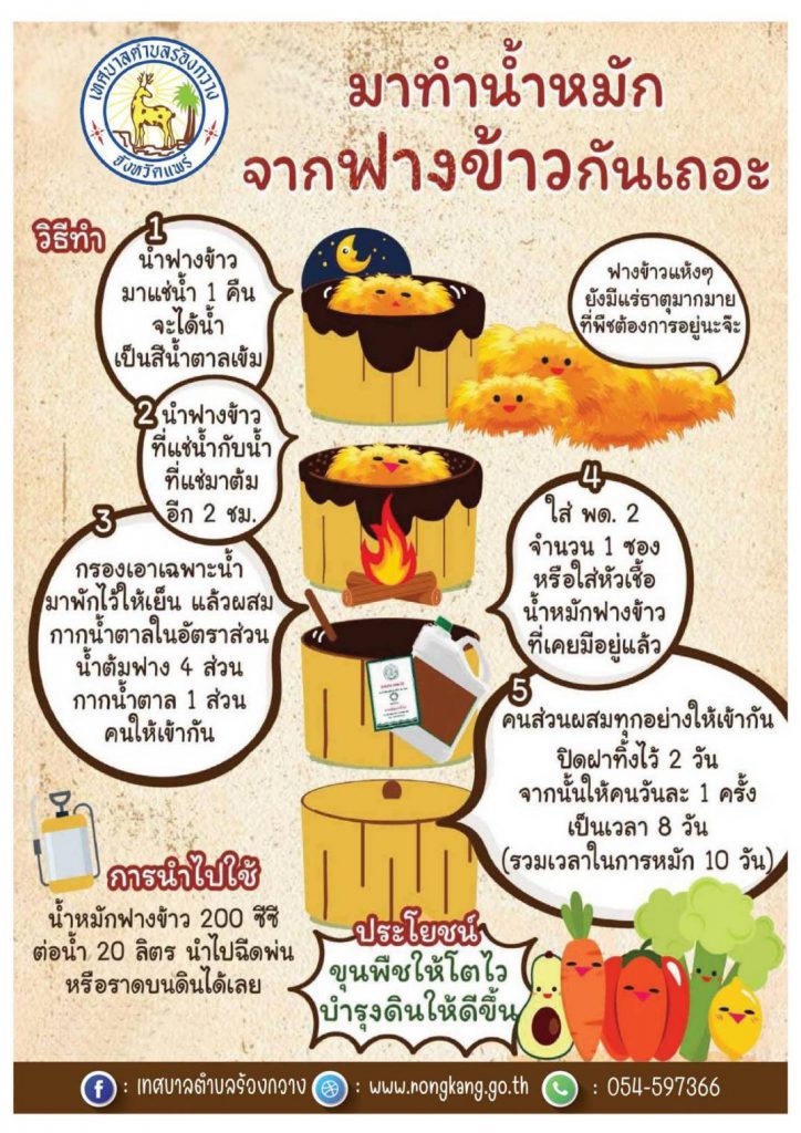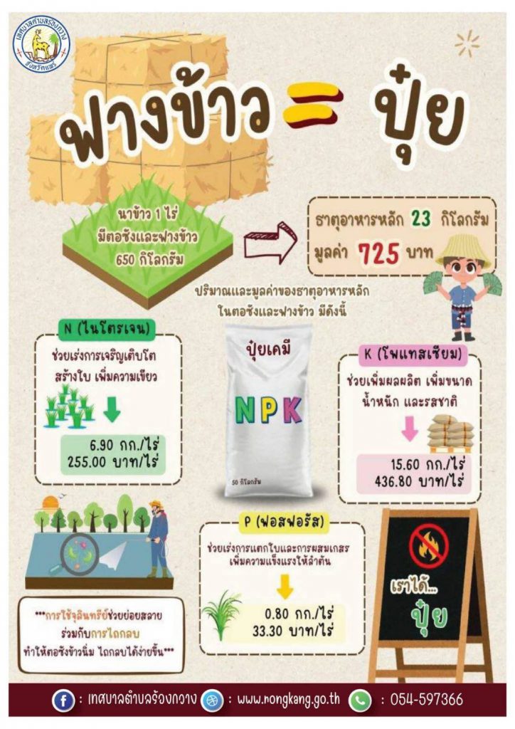 นายพิพัฒน์ ซื่อทรงธรรม นายกเทศมนตรีตำบลร้องกวาง อ.ร้องกวาง จ.แพร่ เผยว่าขอความร่วมมืเกษตรกรหยุดเผาฟางข้าว เปลี่ยนฟางข้าวให้เกิดประโยชน์โดยฟางข้าว(RICE STRAW) และประโยชน์จากฟางข้าวประโยชน์จากฟางข้าว• ใช้เป็นอาหารหยาบสำหรับเลี้ยงโค กระบือ• ใช้ทำปุ๋ยหมัก• ใช้ทำเป็นวัสดุปกคลุมดินหลังการหว่านเมล็ดพืช• ใช้ทำเป็นวัสดุคลุมดินสำหรับรักษาความชุ่มชื้นของดิน และใช้คลุมดินแก้ปัญหาดินเค็ม• ใช้เป็นวัสดุสำหรับการเพาะเห็ดฟาง• ใช้ทำเป็นที่มุงหลังคาหรือฝากระท่อม• ใช้ทำเป็นเชื้อจุดไฟ ช่วยให้ก่อไฟง่าย• ใช้เป็นวัสดุผูกมัดหรือใช้แทนเชือก แต่ต้องนำมาแช่น้ำก่อนเพื่อให้ฟางนุ่ม และป้องกันการแตก ขาด ขณะพันเป็นเกลียวรัด• ใช้เป็นวัสดุสำหรับการปล่อยครั่ง• ใช้ผลิตเป็นเยื่อกระดาษ• ใช้สำหรับการแยกสกัดสารแทนนิน