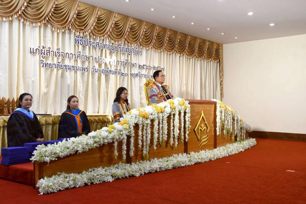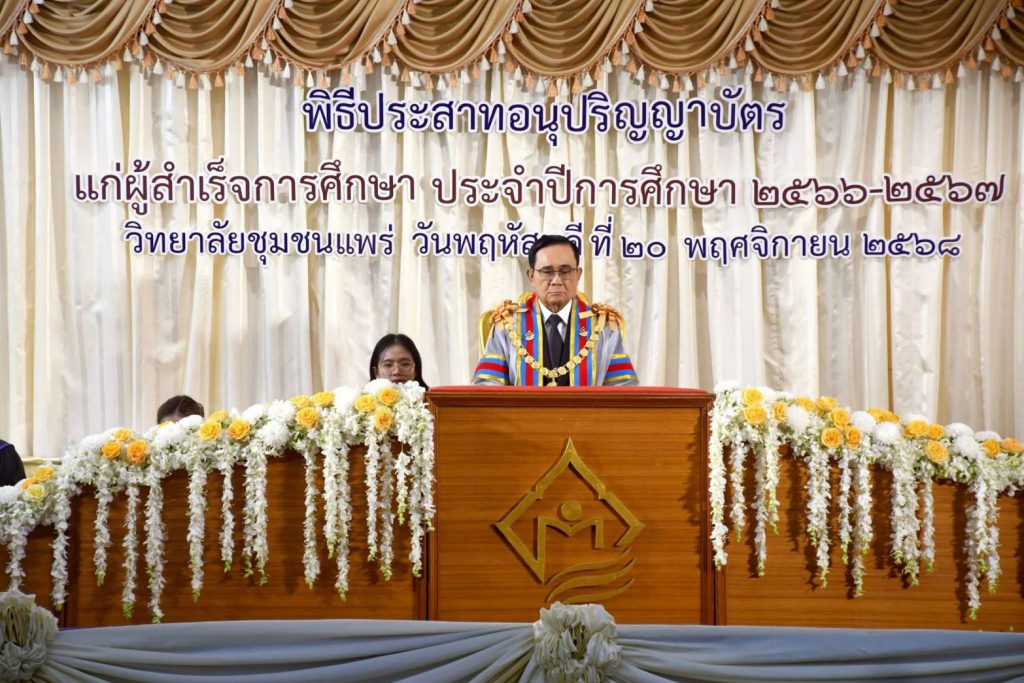 เมื่อวันที่ 20 พฤศจิกายน 2568 เวลา 11.20 น. ที่วิทยาลัยชุมชนแพร่ ตำบลน้ำชำ อำเภอเมืองแพร่ พลเอก ประยุทธ์ จันทร์โอชา องคมนตรี เป็นประธานในพิธีประสาทอนุปริญญาบัตรแก่ผู้สำเร็จการศึกษาวิทยาลัยชุมชนแพร่ ประจำปีการศึกษา 2566–2567 พร้อมมอบประกาศเกียรติคุณแก่ผู้ทำคุณประโยชน์ต่อวิทยาลัยชุมชนแพร่ โดยมีนายสมชัย เลิศประสิทธิพันธ์ ผู้ว่าราชการจังหวัดแพร่ คณะหัวหน้าส่วนราชการ คณะผู้บริหาร และนักศึกษาวิทยาลัยชุมชนแพร่ ร่วมให้การต้อนรับ สำหรับปีการศึกษา 2566–2567 วิทยาลัยชุมชนแพร่มีผู้สำเร็จการศึกษาทั้งหมด 187 คน แยกตามสาขาวิชา ได้แก่สาขาวิชาการจัดการ สาขาวิชาการปกครองท้องถิ่น สาขาวิชาการศึกษาปฐมวัย สาขาวิชาเทคโนโลยีดิจิทัลธุรกิจ สาขาวิชาการบัญชี และสาขาวิชาเทคโนโลยีการเกษตร โอกาสนี้องคมนตรีได้ให้โอวาทและแสดงความยินดีกับผู้สำเร็จการศึกษาทุกคน พร้อมเน้นย้ำให้บัณฑิตนำความรู้ ความสามารถ และคุณธรรมที่ได้รับจากสถาบันไปใช้ให้เกิดประโยชน์ในการดำเนินชีวิต การประกอบอาชีพ และมีบทบาทในการพัฒนาชุมชนจังหวัดแพร่ รวมถึงการขับเคลื่อนประเทศชาติให้เติบโตอย่างมั่นคงและยั่งยืนต่อไป
