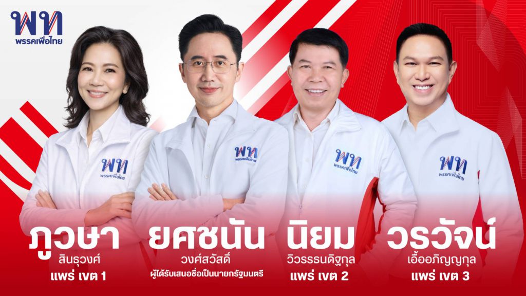 โดยผู้ที่ได้รับการคัดเลือกให้เป็นตัวแทนพรรคเพื่อไทย ได้แก่ เขตเลือกตั้งที่ 1 นางภูวษา สินธุวงศ์ มาทดแทน นพ.ทศพร เสรีรักษ์ที่ย้ายไปพรรคโอภาสใหม่เขตเลือกตั้งที่ 2 หมออุ๋ย นพ.นิยม วิวรรธนดิฐกุล เจ้าของพื้นที่เดิม เขตเลือกตั้งที่ 3 นายวรวัจน์ เอื้ออภิญญกุล คนเดิมเช่นเดียวกันทั้งสามท่านพร้อมอาสาเข้ามาทำหน้าที่เป็นผู้แทนของพี่น้องประชาชน ในนามพรรคเพื่อไทย รับฟังปัญหา ดูแลทุกข์สุข และทำงานเพื่อบ้านเมือง อย่างเต็มกำลังความสามารถเลือกเพื่อไทยครบทั้ง 3 เขตประเทศไทยก้าวสู่ผู้นำแนวใหม่ นายกรัฐมนตรี นักวิทยาศาสตร์ ซึ่งจะใช้ความรู้ ดูแลประชาชน และนำความรู้ ความคิดเป็นระบบ และการทำงานบนพื้นฐานของเหตุผล มาใช้ในการพัฒนาประเทศ เพื่อให้ประชาชนมีคุณภาพชีวิตที่ดีขึ้นอย่างยั่งยืนเลือกเพื่อไทย ทั้งคน ทั้งพรรค