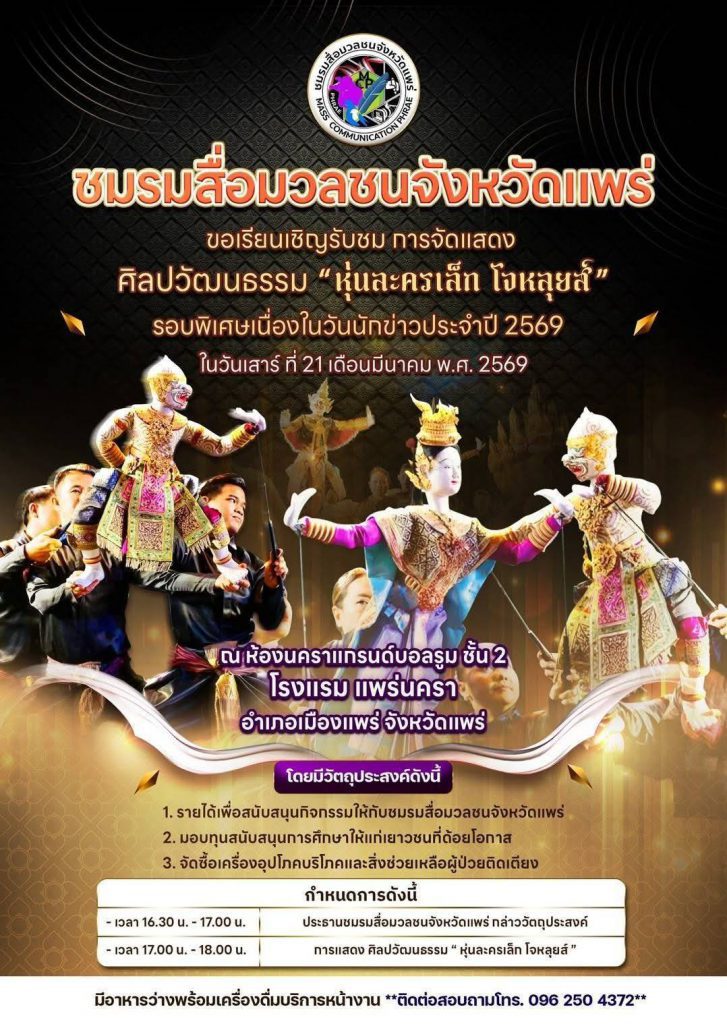ชมรมสื่อมวลชนจังหวัดแพร่ ขอเรียนเชิญรับชมการแสดงศิลปวัฒนะวัฒนธรรม “หุ่นละครเล็กโจหลุยส์” รอบพิเศษเนื่องในวันนักข่าวประจำปี 2569 ในวันเสาร์ที่ 21 เดือน มีนาคม 2569 ณ ห้องนคราแกรนด์บอลรูมชั้น 2 โรงแรมแพร่นครา อำเภอเมือง จังหวัดแพร่ เริ่มเวลา 16.30 – 18.00 น. ///สุธัญญา อ้ายนันท์