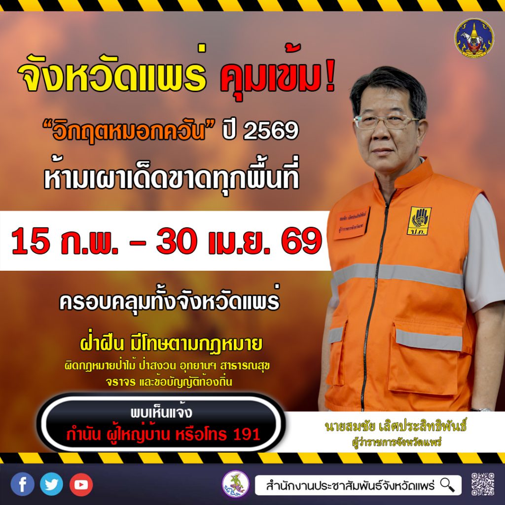 จังหวัดแพร่ประกาศกำหนดช่วงควบคุมเข้มข้น “วิกฤตหมอกควัน” และกำหนด “เขตควบคุมไฟป่าและการเผาในที่โล่ง” ประจำปี 2569 ระหว่างวันที่ 15 กุมภาพันธ์ ถึง 30 เมษายน 2569 ครอบคลุมทุกพื้นที่ในจังหวัดแพร่ เพื่อป้องกันและแก้ไขปัญหาฝุ่นละอองจากไฟป่าและการเผาในที่โล่ง ซึ่งมักเกิดขึ้นในช่วงฤดูแล้ง ส่งผลกระทบต่อคุณภาพอากาศ สุขภาพประชาชน เศรษฐกิจ การท่องเที่ยว และทรัพยากรธรรมชาติ โดยควบคุมเข้มงวดการเผาทุกพื้นที่ ได้แก่ พื้นที่ป่า พื้นที่เกษตรกรรม พื้นที่ริมทางหลวง พื้นที่ชุมชน และพื้นที่เมือง หากมีความจำเป็นต้องบริหารจัดการเชื้อเพลิงด้วยการเผา ต้องขออนุญาตจากกำนันหรือผู้ใหญ่บ้านในเขตปกครอง และประสานหน่วยงานที่รับผิดชอบก่อนดำเนินการทุกครั้ง พร้อมจัดทำแนวกันไฟและควบคุมการเผาอย่างใกล้ชิดไม่ให้ลุกลาม โดยจังหวัดจะพิจารณาปัจจัยด้านคุณภาพอากาศประกอบการอนุญาต*** ผู้ใดฝ่าฝืนจุดไฟเผาป่าหรือเผาในที่โล่ง จะมีความผิดตามกฎหมายที่เกี่ยวข้อง อาทิ กฎหมายป่าไม้ ป่าสงวนแห่งชาติ อุทยานแห่งชาติ สงวนและคุ้มครองสัตว์ป่า ป้องกันและบรรเทาสาธารณภัย สาธารณสุข จราจรทางบก รวมถึงข้อบัญญัติท้องถิ่น โดยมีบทกำหนดโทษตามกฎหมาย*** จังหวัดแพร่ขอความร่วมมือประชาชนแจ้งเหตุการเผาในที่โล่งตามพื้นที่รับผิดชอบ ได้แก่พื้นที่อุทยาน/ป่าไม้/ป่าสงวน แจ้งหน่วยงานป่าไม้ในพื้นที่ หรือสายด่วนกรมป่าไม้ 1362 / กรมอุทยานฯ 1362 พื้นที่เกษตรกรรมและชุมชน แจ้งกำนัน ผู้ใหญ่บ้าน เจ้าหน้าที่ท้องถิ่น หรือสายด่วนตำรวจ 191เขตเทศบาลเมืองแพร่ แจ้งศูนย์ปฏิบัติการฉุกเฉินเทศบาลเมืองแพร่ พื้นที่ริมทางหลวง แจ้งหน่วยงานทางหลวง หรือสายด่วนทางหลวง 1586 / ทางหลวงชนบท 1146 ทั้งนี้ประกาศดังกล่าวมีผลตั้งแต่วันที่ 15 กุมภาพันธ์ ถึง 30 เมษายน 2569 ประกาศ ณ วันที่ 9 มกราคม 2569 *** ขอให้ประชาชนร่วมมือปฏิบัติเพื่อลดหมอกควันและรักษาคุณภาพอากาศของจังหวัดแพร่โดยทั่วกัน.